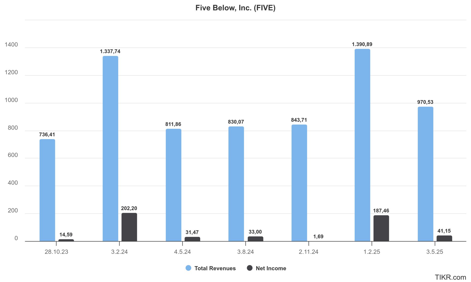 đFive Below ist zurĂźck auf der BĂźhne â und das mit einem Paukenschlag. Nach einem schwachen Jahr 2024 meldete der US-Discounthändler in seinem ersten Quartal 2025 ein Umsatzplus von satten 19,5 % auf 970,5 Mio. US-Dollar. Besonders beeindruckend: Die vergleichbaren Verkäufe stiegen um 7,1 %, getragen von mehr Kunden und nicht nur von hĂśheren Preisen. Das ist im hart umkämpften Retail-Markt ein starkes Signal.