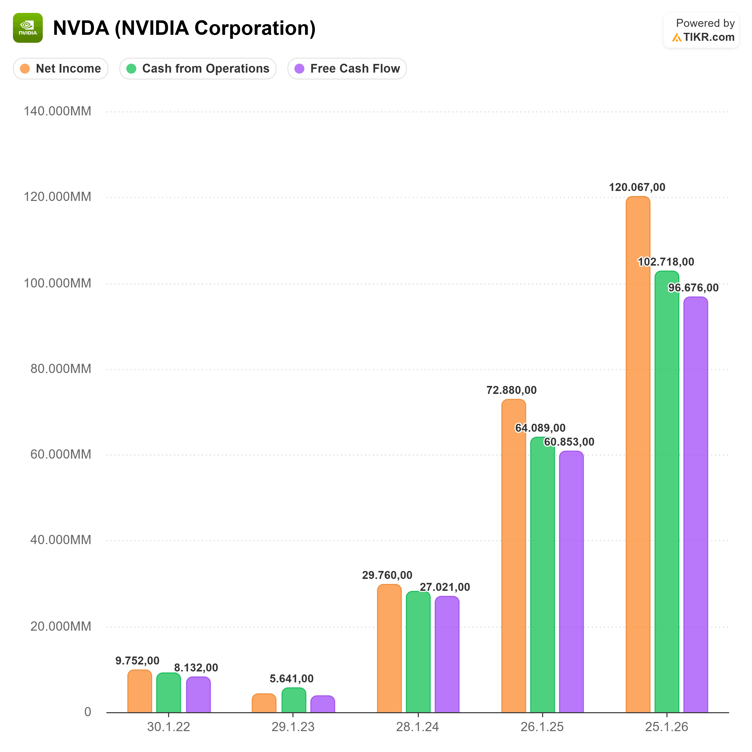 Wenn du SpaceX kaufst, kaufst Du unter anderem die Hoffnung auf orbitale KI-Rechenzentren. Wenn Du 👉Nvidia kaufst, kaufst Du den Engpass, durch den jede KI-Infrastruktur auf der Erde läuft. Mit einem Marktanteil von 80 bis 85 % bei Rechenzentrum-KI-Beschleunigern gibt es faktisch keinen ernstzunehmenden Wettbewerber. In seinem Quartal 2026 erzielte Nvidia 57 Milliarden Dollar Umsatz – eine Zahl, die jeden klassischen Maßstab für Chipunternehmen sprengt.