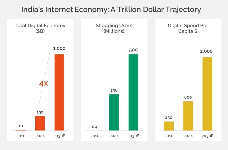 Die Analyse „Click, watch, shop: The consumer opportunity in India” von Bessemer Venture Partners zeigt, wie sehr der 👉 HANetf INQQ India Internet UCITS ETF am Zahn der Zeit ist. Demnach besteht für die indische Digitalwirtschaft bis zum Jahr 2030 eine Billion-Dollar-Chance. Dabei wäre eine Vervierfachung der Umsätze im Vergleich zum heutigen Stand möglich, angetrieben durch eine bessere Monetarisierung digitaler Konsumgewohnheiten und KI-getriebene Personalisierung entlang der gesamten Customer Journey.