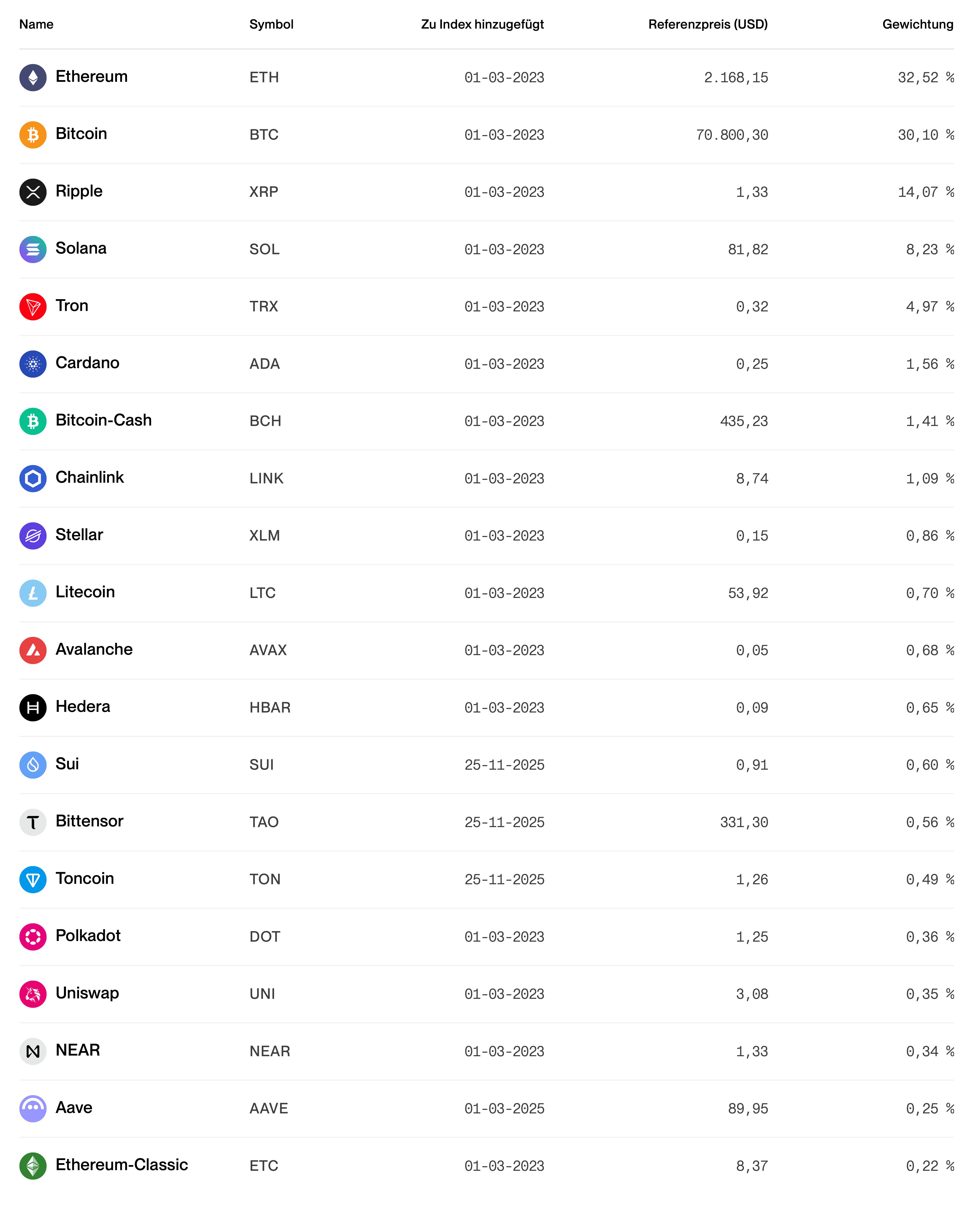 Durch dieses regelmäßige Rebalancing werden schwache Projekte, die stark an Marktkapitalisierung verlieren, vollautomatisch aus dem Index abgestoßen. Gleichzeitig rücken neue, technologisch überzeugende Netzwerke, die sich in Krisenzeiten behaupten können, in dein Portfolio auf. Dieser fortlaufende Selbstreinigungsprozess hält dein langfristiges Investment stets aktuell und reagiert systematisch auf Veränderungen der Marktkapitalisierung.
