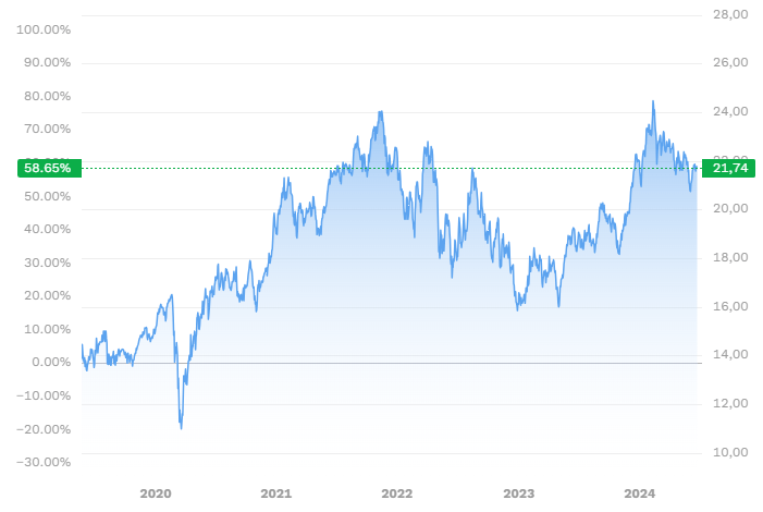 💼 Der ETF hat ein Volumen von 2,34 Mrd. US-Dollar und ist seit September 2015 auf dem Markt. Die laufenden Gebühren liegen bei 0,69 %. Der ETF ist thesaurierend, das bedeutet, dass Dividenden reinvestiert werden und nicht ausgezahlt. Seit Mai 2019 ging es um mehr als 58 % nach oben.