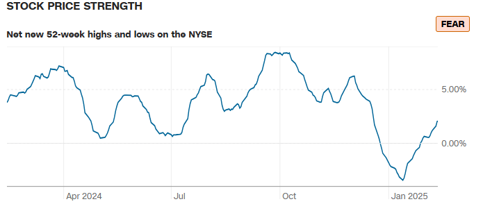 *Einige wenige große Aktien können die Renditen für den Markt verzerren. Es ist auch wichtig zu wissen, wie viele Aktien gut abschneiden und wie viele Probleme haben. Dies zeigt die Anzahl der Aktien an der NYSE auf 52-Wochen-Hochs im Vergleich zu denen auf 52-Wochen-Tiefs. Wenn es viel mehr Hochs als Tiefs gibt, ist das ein bullisches Zeichen und signalisiert Gier.