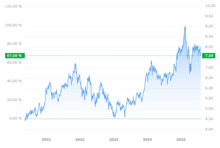 Die Top 10 machen über 54 % des ETF-Volumens aus, was den Fonds sehr fokussiert, aber auch anfälliger für Rücksetzer macht. Die Performance: +21 % in den vergangen 12 Monaten, +42 % auf 3 Jahre, aber auch mit starker Volatilität (29,6 %).