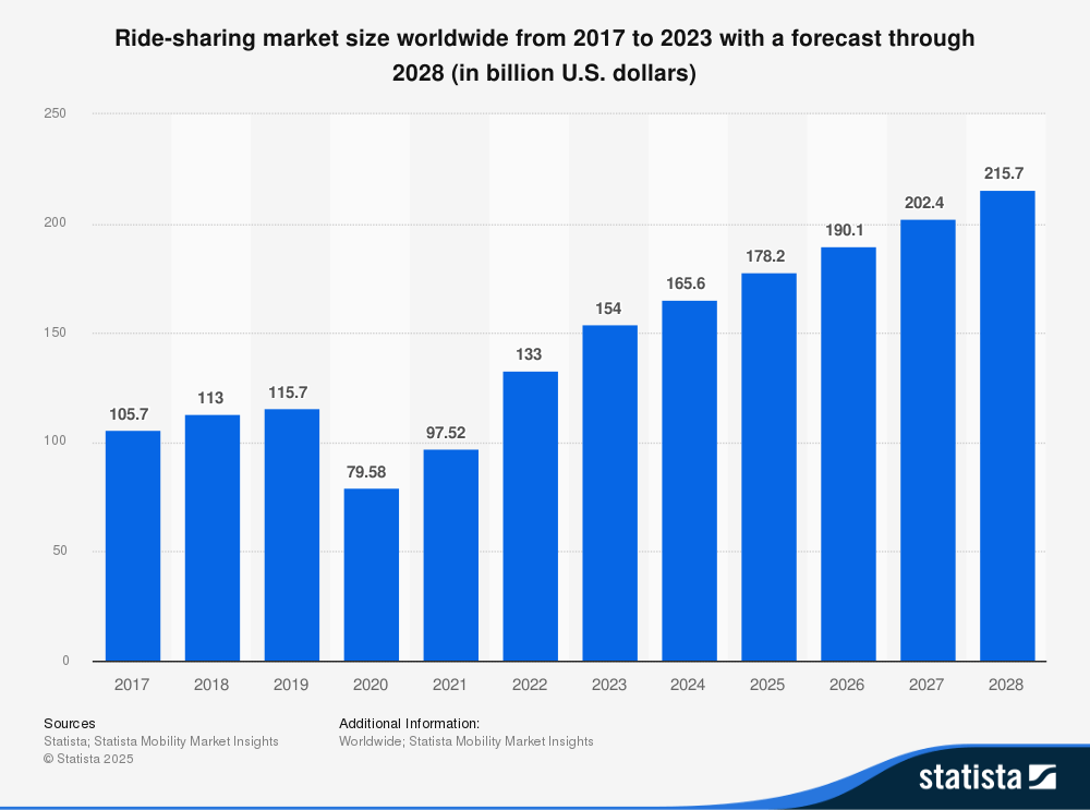 🚗 Der weltweite Mobilitätsmarkt steht an einem historischen Wendepunkt. Während das klassische Ridesharing 2025 mit 163,7 Mrd. US-Dollar einen neuen Höchststand erreicht, wächst es bis 2030 „nur“ auf 210,2 Mrd. US-Dollar (CAGR 5,06 %).