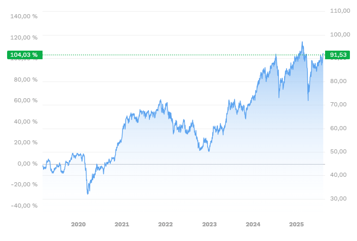 🚀 Der ETF ist ein klarer Überflieger unter den Themen-ETFs. Seit März 2019 hat er sich im Börsenwert verdoppelt. Dazu kommt eine spannende Gesamtkostenquote (TER) von nur 0,35 % – ein Kostenargument, das in dieser Themenklasse seinesgleichen sucht.