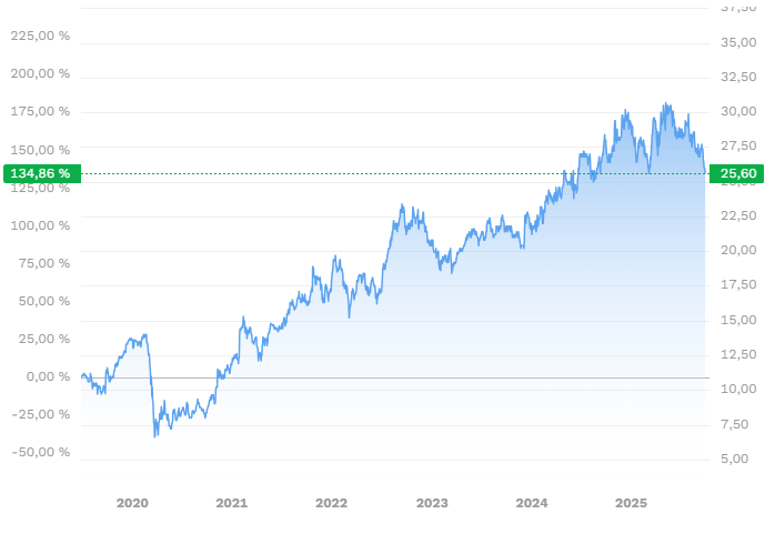 🏦 ICICI Bank setzt auf digitale Innovation. Über 90 % aller Transaktionen laufen bereits digital, während das Kreditwachstum breit gestreut ist. Besonders Business Banking legte zuletzt um 34 % zu. Die Asset-Qualität verbessert sich kontinuierlich. Die Bruttoschuldnerausfälle (Gross NPAs) liegen bei nur 1,67 %. Diese Kennzahl misst den Anteil der notleidenden Kredite am gesamten Kreditportfolio – je niedriger, desto stabiler ist die Bank aufgestellt. Mit 195 % Kurszuwachs in den vergangenen fünf Jahren bei gleichzeitig geringer Volatilität zählt ICICI Bank damit zu den Top-Performern des indischen Finanzsektors.