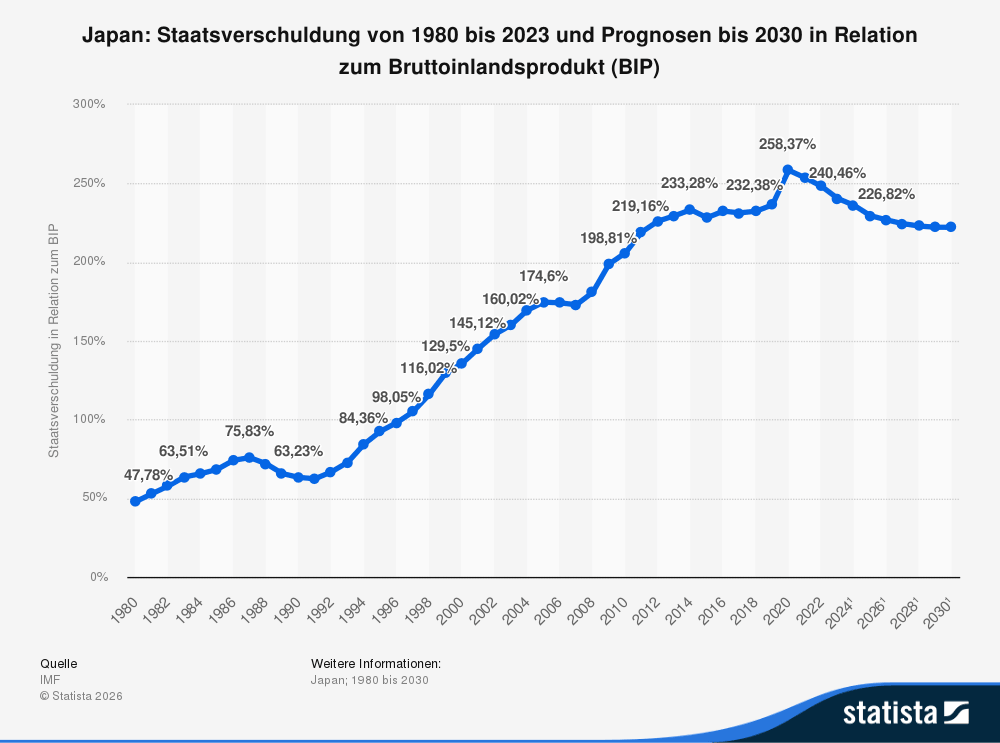 Der entscheidende Grund, warum Japan so wenig Handlungsspielraum hat, ist selbst verschuldet – im buchstäblichen Sinne. Die Staatsverschuldung liegt laut IWF bei 230 % des BIP, dem höchsten Wert aller entwickelten Volkswirtschaften weltweit. Ende 2025 erreichten Japans Gesamtschulden den Rekordstand von 1.342 Billionen Yen – umgerechnet 8,6 Billionen Dollar.
