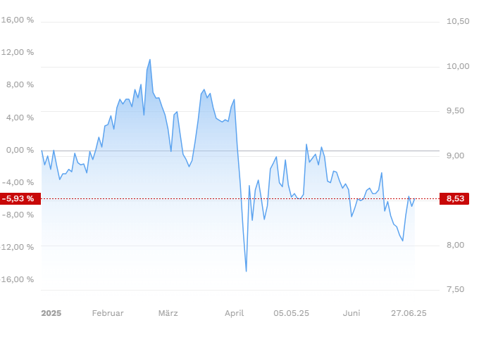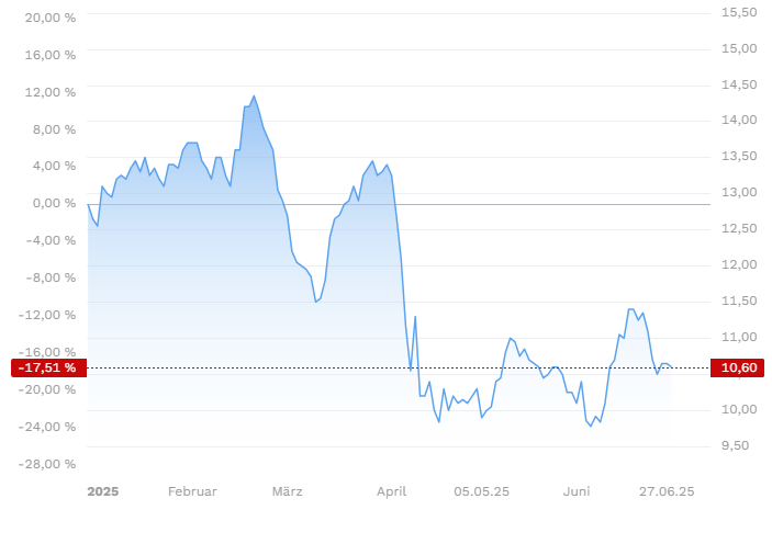 👉Vale, der weltgrößte Eisenerzproduzent, erscheint recht günstig bewertet (KGV 7,4), leidet aber noch unter schwachen Rohstoffpreisen. Mit -6 % YTD hinkt die Aktie dem Markt hinterher. Wer an eine Rohstoff-Erholung glaubt – insbesondere bei Kupfer – findet hier einen potenziellen Turnaround-Kandidaten mit 8,7 % Dividendenrendite.