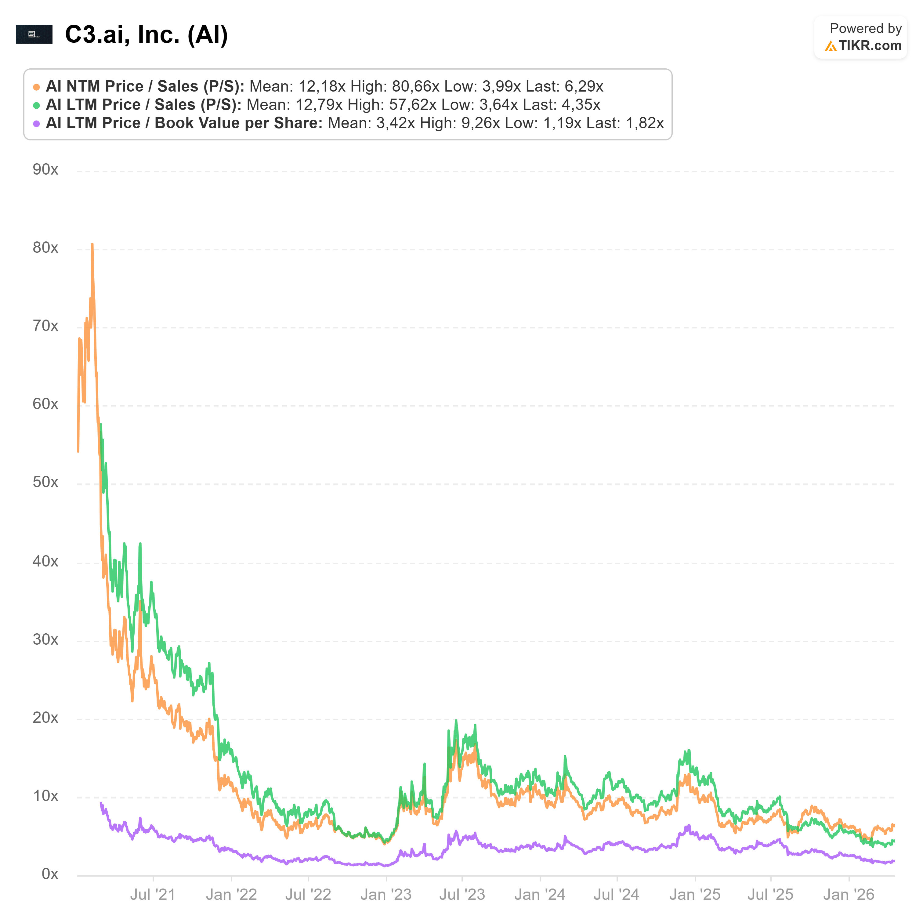 Die Zahlen bestätigen diesen Eindruck. Im dritten Quartal 2025/26 lag der Umsatz bei 53,3 Millionen Dollar, rund 30 % unter dem Analystenkonsens von 75,82 Millionen Dollar. Der Non-GAAP-operative Verlust für das Gesamtjahr soll bis zu 228 Millionen Dollar betragen. Und das bei einem Jahresumsatz von maximal 251 Millionen Dollar. Zum Vergleich: Palantir erzielt heute in einem einzigen Quartal mehr als das Doppelte dieses Jahresumsatzes, mit steigender Gewinnmarge.