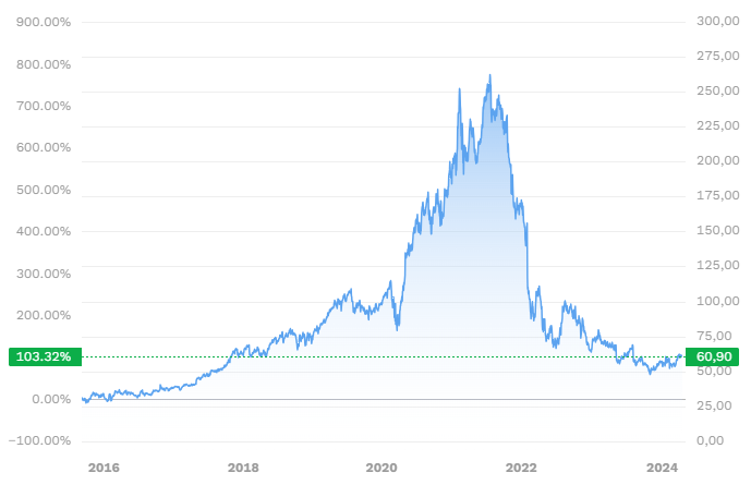 Nach einem steilen Anstieg in der Vergangenheit ist 👉PayPals Marktwert von einem Höhepunkt im Jahr 2021 um rund 80 % gefallen und liegt derzeit bei 63 Mrd. Euro. Die Beliebtheit von Diensten wie Venmo, besonders unter jüngeren Nutzern, und die Rolle von PayPal als Standard-Option für Online-Zahlungen haben in den vergangenenenen Jahren nachgelassen. Konkurrenz durch Apple und Google sowie ein Rückgang im Online-Shopping nach der Pandemie haben zu einem Umsatzrückgang geführt. Dies zwang PayPal dazu, sich auf weniger profitable Produkte, wie die Bereitstellung von White-Label-Zahlungsdiensten, zu konzentrieren.