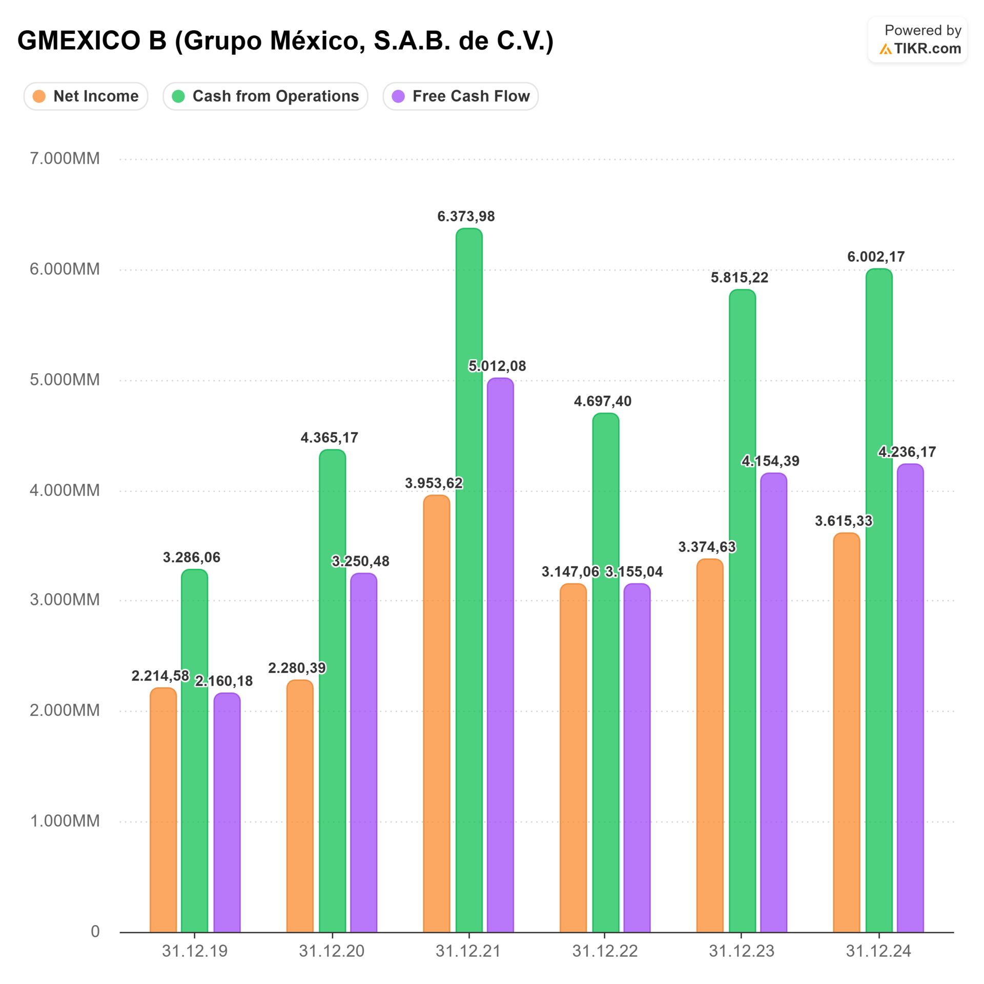 🟧 Grupo Mexico ist mit 54,73 Mrd. Euro Marktkapitalisierung eine der zentralen Figuren im mexikanischen Aktienmarkt – und eines der spannendsten Vehikel, wenn Du die Energiewende spielen willst. Das Unternehmen kontrolliert über 👉Southern Copper eine der weltweit größten Kupferproduktionen, dazu kommt das größte Eisenbahnnetz Mexikos und ein wachsender Infrastrukturbereich. Operativ liefert Grupo Mexico solide, aber nicht spektakuläre Wachstumsraten: Der Umsatz steigt um 7,60 %, das EBIT um 15,74 %, der Free Cashflow um 19,43 %.