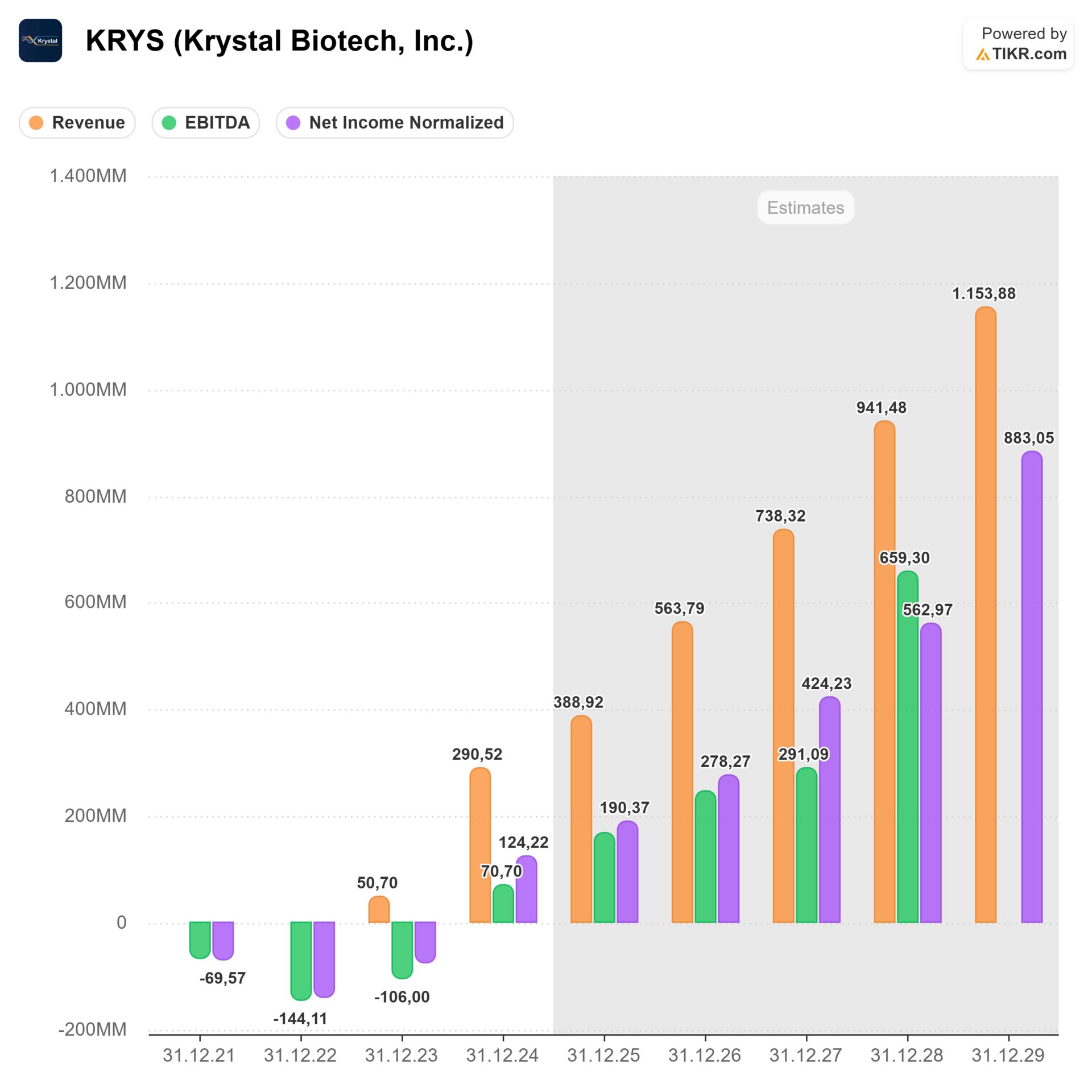 Wenn Du als Investor langfristig denkst, solltest Du den operativen Hebel verstehen. Das bedeutet: Während der Umsatz durch neue Zulassungen explodiert, steigen die Kosten für Forschung und Verwaltung (SG&A und R&D) deutlich langsamer an. In einem optimistischen Szenario könnte Krystal bis 2030 einen Jahresumsatz von 5 Milliarden Dollar erzielen.