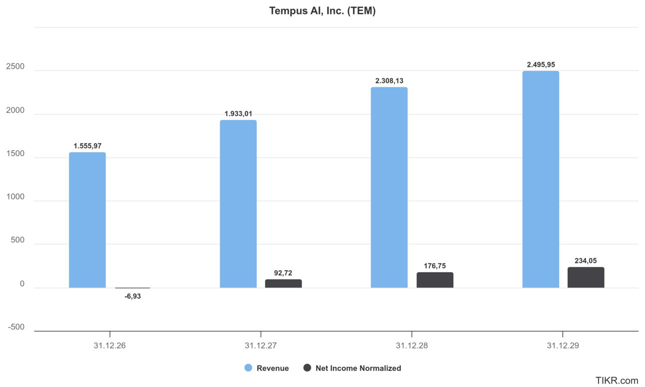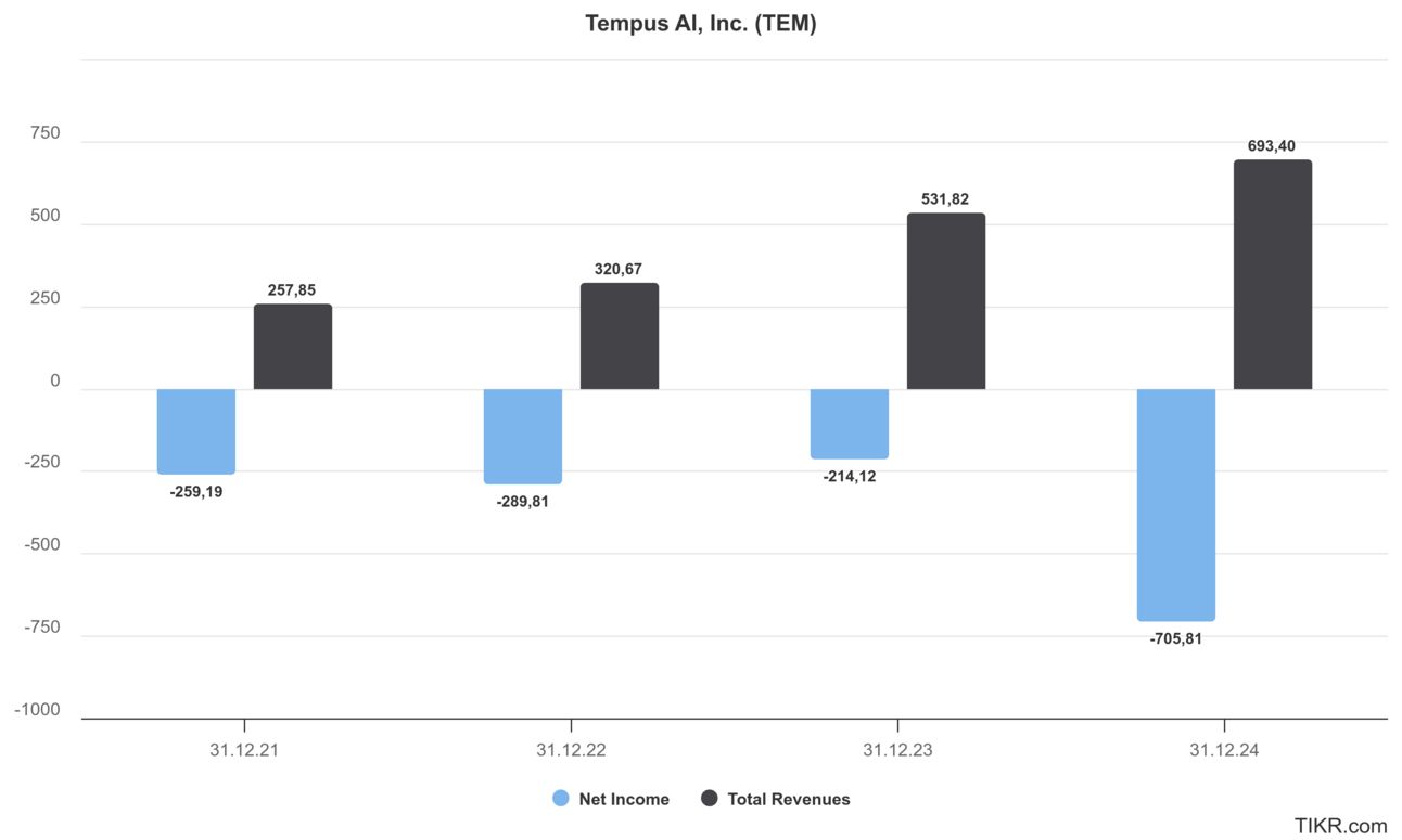 📉 Trotz aller Euphorie: Tempus ist noch nicht profitabel. Der Nettoverlust 2024 lag bei 709 Mio. Dollar, das operative Minus bei 707 Mio. Dollar. Die hohe Forschungsquote (38 % der Umsätze) und der Cash-Burn (-211 Mio. Dollar Free Cash Flow) sind kritische Punkte – aber Teil der aggressiven Wachstumsstrategie.