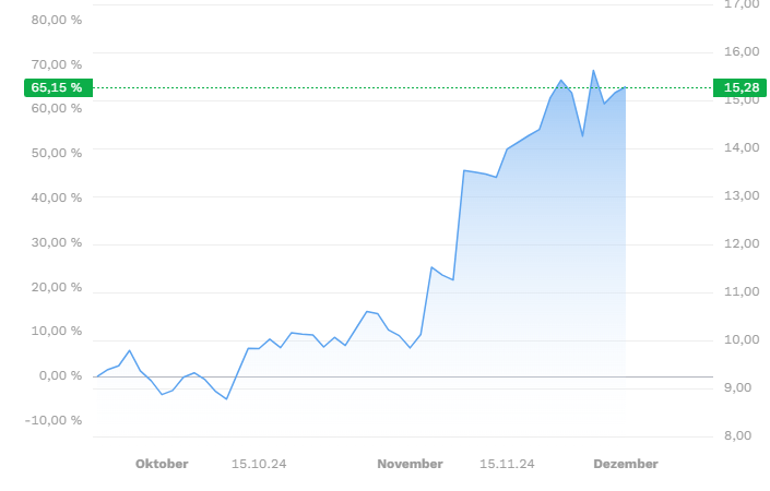 📊 Seit seiner Auflage vor wenigen Wochen hat 👉das ETP bereits deutlich zweistellige Gewinne erzielt. Dank des neuen Krypto-Schubs durch Donald Trumps Wahlversprechen, die USA zum „Krypto-Zentrum“ zu machen, erwarten Krypto-Enthusiasten, dass die Krypto-Euphorie noch einige Zeit weitergehen könnte. Und mit dem Anteilspreis von aktuell rund 15 Euro bleibt der Einstieg erschwinglich.