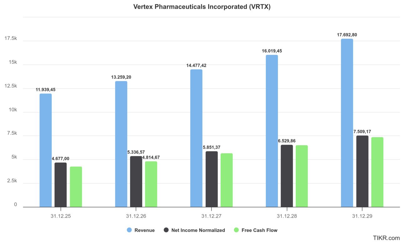 Die Gen-Therapie Casgevy (gegen Sichelzellanämie) und Zimislecel (Typ-1-Diabetes) sollen zusammen 2,25 Mrd. Dollar zum Gesamtumsatz beitragen. Analystenschätzungen sehen das Gesamtumsatzpotenzial für 2030 bei rund 19,3 Mrd. Dollar – ein Plus von 75 % gegenüber 2024. Selbst bei konservativer Marge von 42 % könnte der Gewinn auf über 6 Mrd. Dollar steigen. Risiken wie steigende Forschungskosten, Konkurrenz und politische Eingriffe bleiben – doch Vertex erscheint strategisch recht gut aufgestellt zu sein, um von mehreren milliardenschweren Märkten profitieren zu können.